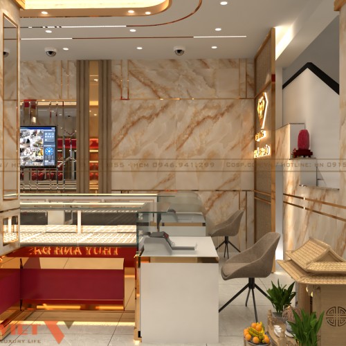 Không gian được chia thành các khu vực rõ ràng, bao gồm khu trưng bày chính, khu vực giao dịch và không gian phụ trợ khác. Các tủ kính được bố trí hợp lý, tạo sự thuận tiện cho khách hàng khi di chuyển và quan sát sản phẩm.