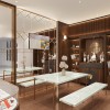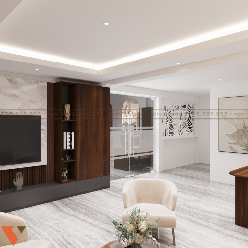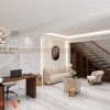 Không gian sử dụng chủ đạo vật liệu gỗ với tông màu trầm, mang lại cảm giác ấm cúng và ổn định. Sàn đá sáng màu được lựa chọn để cân bằng tổng thể, giúp không gian không bị nặng nề. Sự kết hợp giữa gỗ, đá và kim loại ánh vàng tạo nên chiều sâu thẩm mỹ rõ rệt.