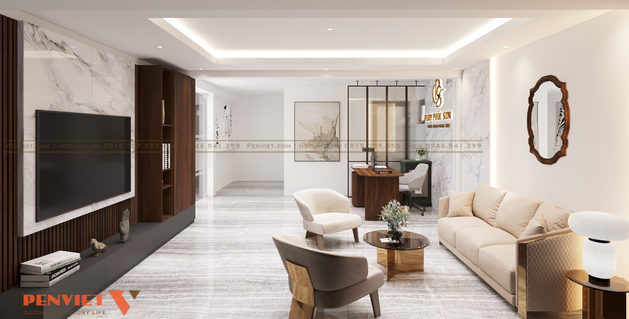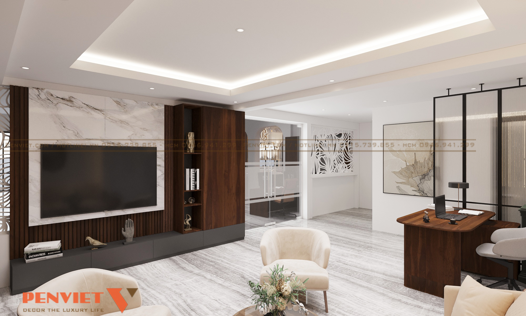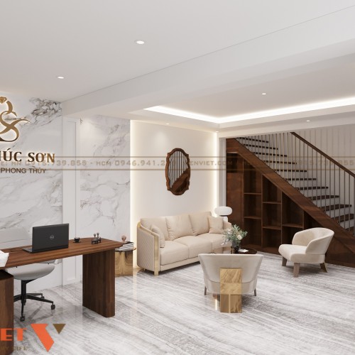 Dự án bố trí riêng khu vực tiếp khách và tư vấn, tạo sự khác biệt so với các cửa hàng phong thủy truyền thống. Không gian này được thiết kế như một phòng khách nhỏ, mang lại cảm giác thân thiện và riêng tư. Ghế ngồi, bàn trà và ánh sáng được sắp xếp hài hòa, giúp khách thoải mái khi trao đổi.