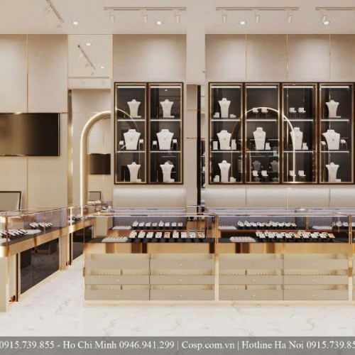 Trên các bức tường chính là hệ thống tủ trưng bày âm tường có cửa kính đóng mở và khung viền màu đen ánh vàng. Các bục trưng bày bên trong được bố trí theo cấp bậc, phân tầng cao thấp để tạo chiều sâu, giúp bộ sưu tập không bị đơn điệu. Các mannequin cổ trưng bày dây chuyền, khay trưng bày nhẫn, lắc tay… đều có tông màu trắng sứ cao cấp, nhấn mạnh sản phẩm là trung tâm.