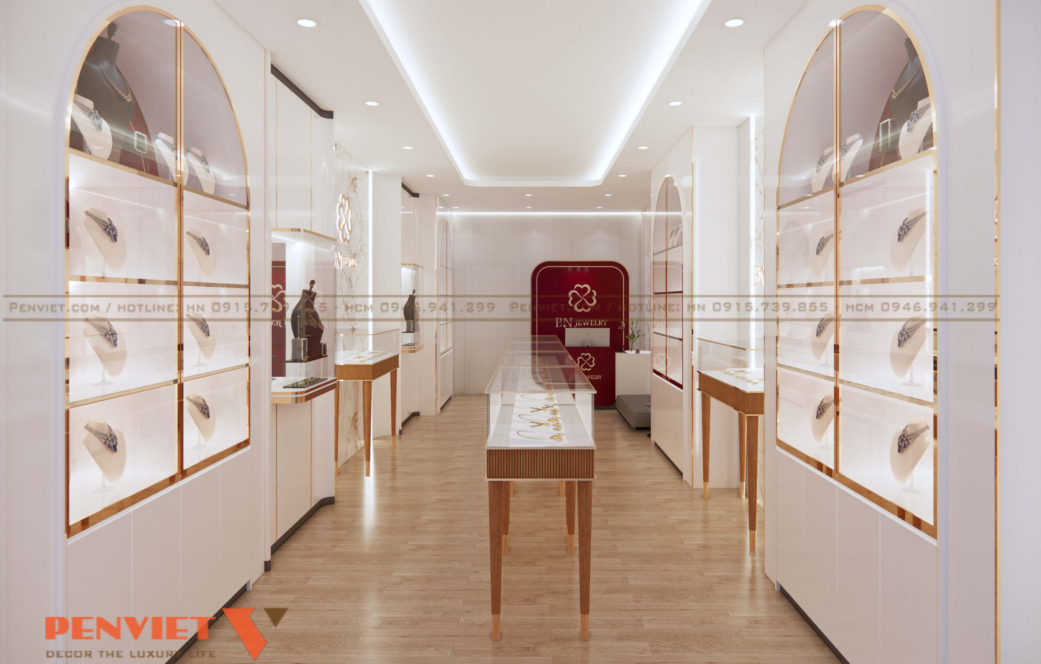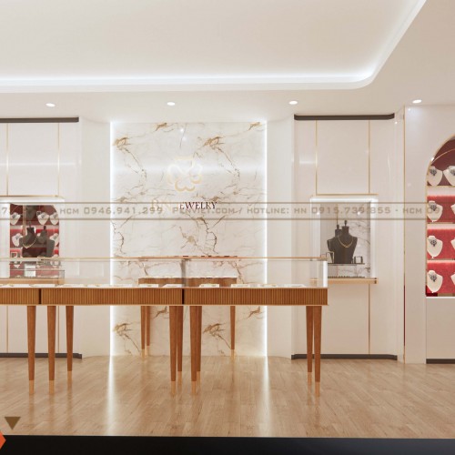 Khu vực này hỗ trợ tốt cho việc tư vấn, thanh toán và chăm sóc khách hàng. Thiết kế chú trọng sự gọn gàng, giúp nhân viên thao tác nhanh và chính xác. Đây là yếu tố quan trọng với các cửa hàng trang sức có diện tích nhỏ.