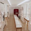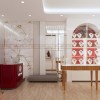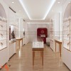 Không gian được tổ chức theo trục dọc, tạo lối đi thẳng và rõ ràng từ cửa vào đến quầy trung tâm. Cách bố trí này giúp cửa hàng trông sâu và rộng hơn so với diện tích thực. Tông màu trắng chủ đạo kết hợp ánh kim vàng mang lại cảm giác sạch sẽ, sang trọng. Ánh sáng được tính toán kỹ, vừa đủ làm nổi bật sản phẩm nhưng không gây chói mắt.