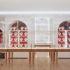 Hệ tủ trưng bày áp tường được thiết kế dạng vòm, tạo điểm nhấn mềm mại và khác biệt so với các cửa hàng trang sức truyền thống. Khung viền ánh kim kết hợp kính trong giúp sản phẩm trở thành tâm điểm. Các tầng trưng bày được chia tỷ lệ hợp lý, phù hợp cho nhiều dòng trang sức khác nhau.