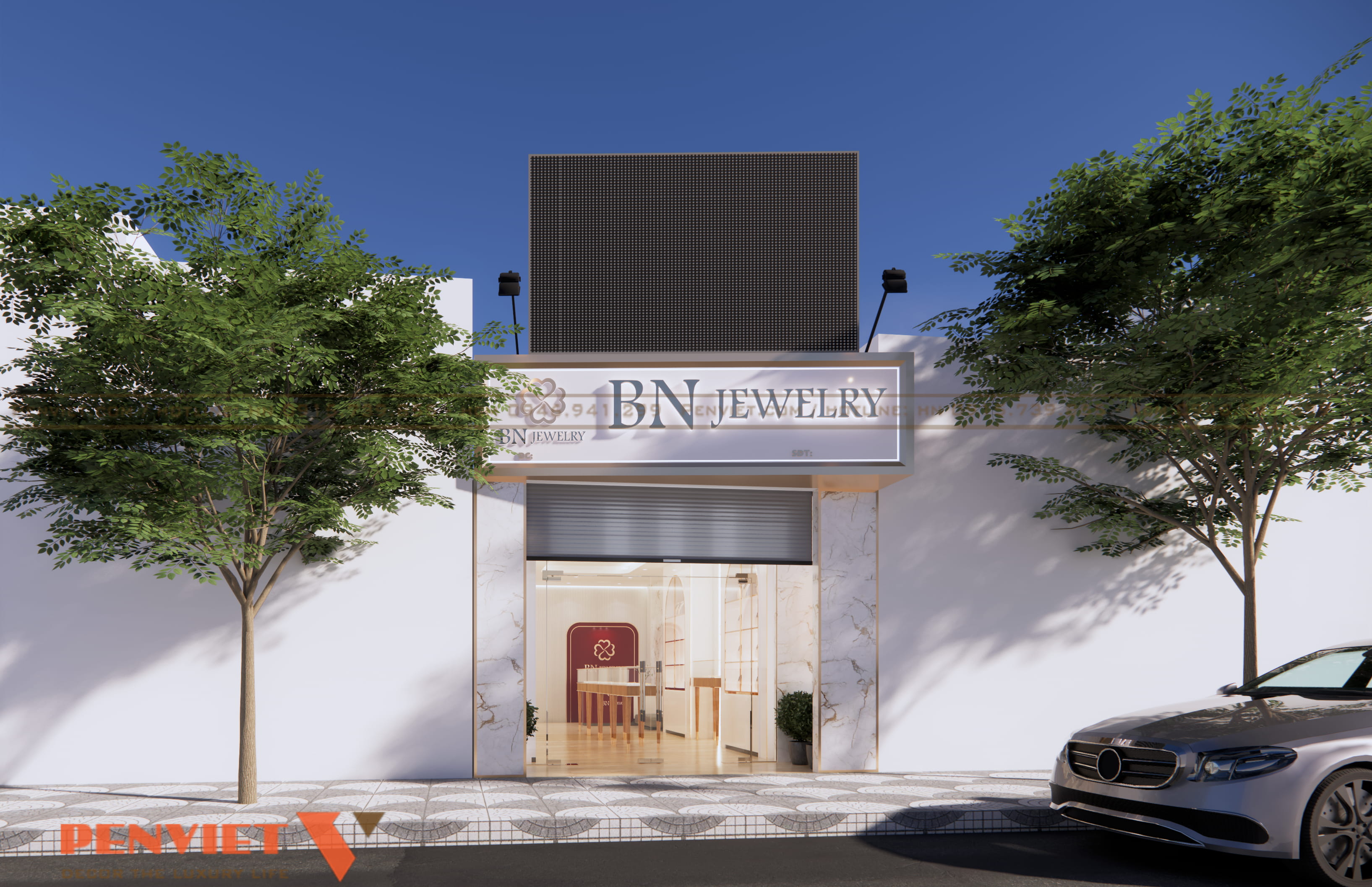 Mặt tiền thiết kế tiệm trang sức BN Jewelry gọn gàng nhưng nổi bật. Biển hiệu sáng, chữ rõ ràng giúp thương hiệu dễ nhận diện từ xa. Mảng ốp đá sáng màu kết hợp kính trong tạo cảm giác cao cấp ngay từ bên ngoài. Không gian bên trong được nhìn thấy rõ, tạo sự tin tưởng cho khách hàng bước vào.