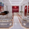 Hệ đèn spotlight được bố trí đều trên trần, tập trung chiếu vào sản phẩm. Ánh sáng trắng kết hợp ánh vàng tạo độ lấp lánh cho trang sức. Trần phẳng tích hợp đèn âm giúp không gian gọn gàng và hiện đại.