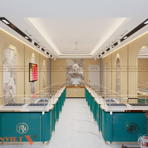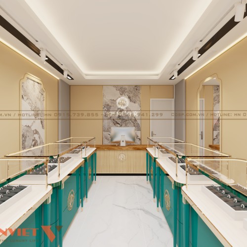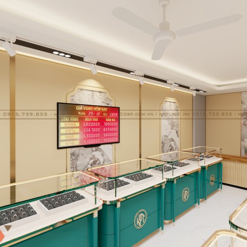 Các quầy trưng bày được làm từ chất liệu gỗ MDF lõi xanh cao cấp chống ẩm vượt trội, giúp bảo vệ trang sức khỏi tác động từ môi trường. Bề mặt quầy được phủ sơn PU bóng mịn màu xanh ngọc, kết hợp với viền inox mạ vàng, tạo nên sự hài hòa giữa vẻ đẹp hiện đại và cổ điển.