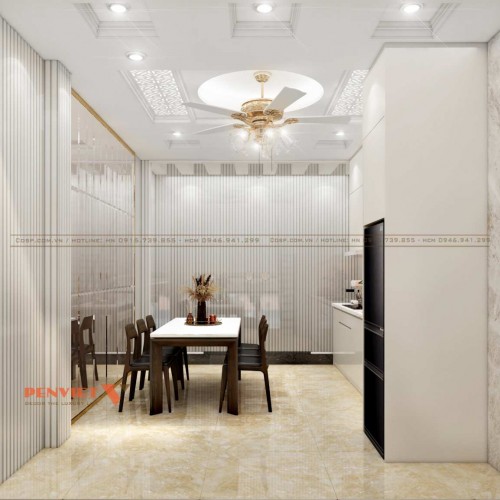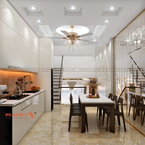 Tiếp đến là không gian bên trong với khu vực phòng ăn và nhà bếp của gia chủ. Đây là nơi để phục vụ ăn uống cho nhân viên và gia đình. Việc sử dụng các vật liệu như inox sáng bóng và gỗ MDF chống ẩm cho các chi tiết nội thất sẽ nâng cao tính thẩm mỹ và đảm bảo độ bền. Điều này góp phần làm tăng giá trị và sự sang trọng của không gian.