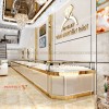 Một trong những điểm nhấn nổi bật nhất của tiệm vàng là hệ tủ trưng bày được đặt kéo dài hình chữ L. Chiếc tủ này được trang trí với nẹp viền inox sáng bóng, tạo nên sự lấp lánh và lôi cuốn. Việc sử dụng inox không chỉ mang đến vẻ đẹp hiện đại mà còn giúp tủ trưng bày nổi bật hơn. Bên trong các tủ còn được trang bị hệ thống đèn LED chiếu sáng làm nổi bật các sản phẩm trang sức và tạo nên hiệu ứng lung linh cho không gian trưng bày.