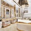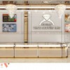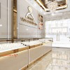 Quầy trưng bày được thiết kế với mặt kính trong suốt, tạo điều kiện cho khách hàng dễ dàng quan sát từng sản phẩm trang sức tinh xảo. Các ánh đèn pha lê lung linh treo trên trần không chỉ tạo điểm nhấn cho tiệm mà còn phản chiếu lên các sản phẩm, làm chúng thêm phần lấp lánh và hấp dẫn.