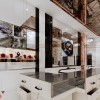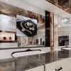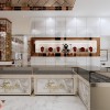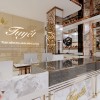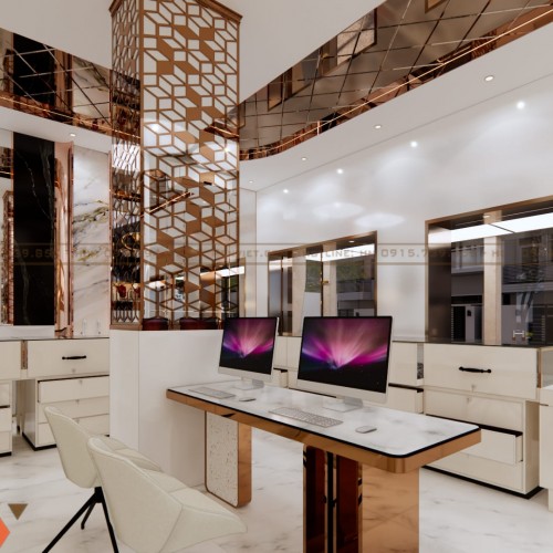 Bên trong tiệm sử dụng layout quầy chữ U, giúp tối đa hóa diện tích trưng bày. Hệ tủ kính được thiết kế thấp, tạo sự gần gũi và dễ quan sát sản phẩm. Mặt đá sáng màu kết hợp viền kim loại vàng tạo hiệu ứng sang trọng.