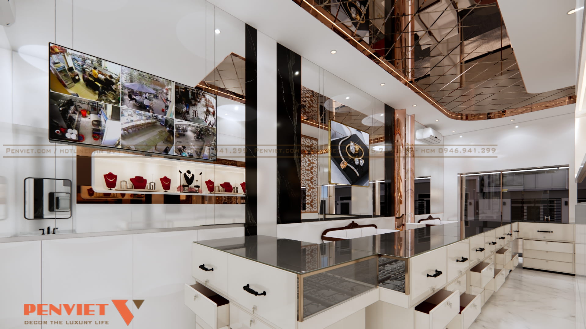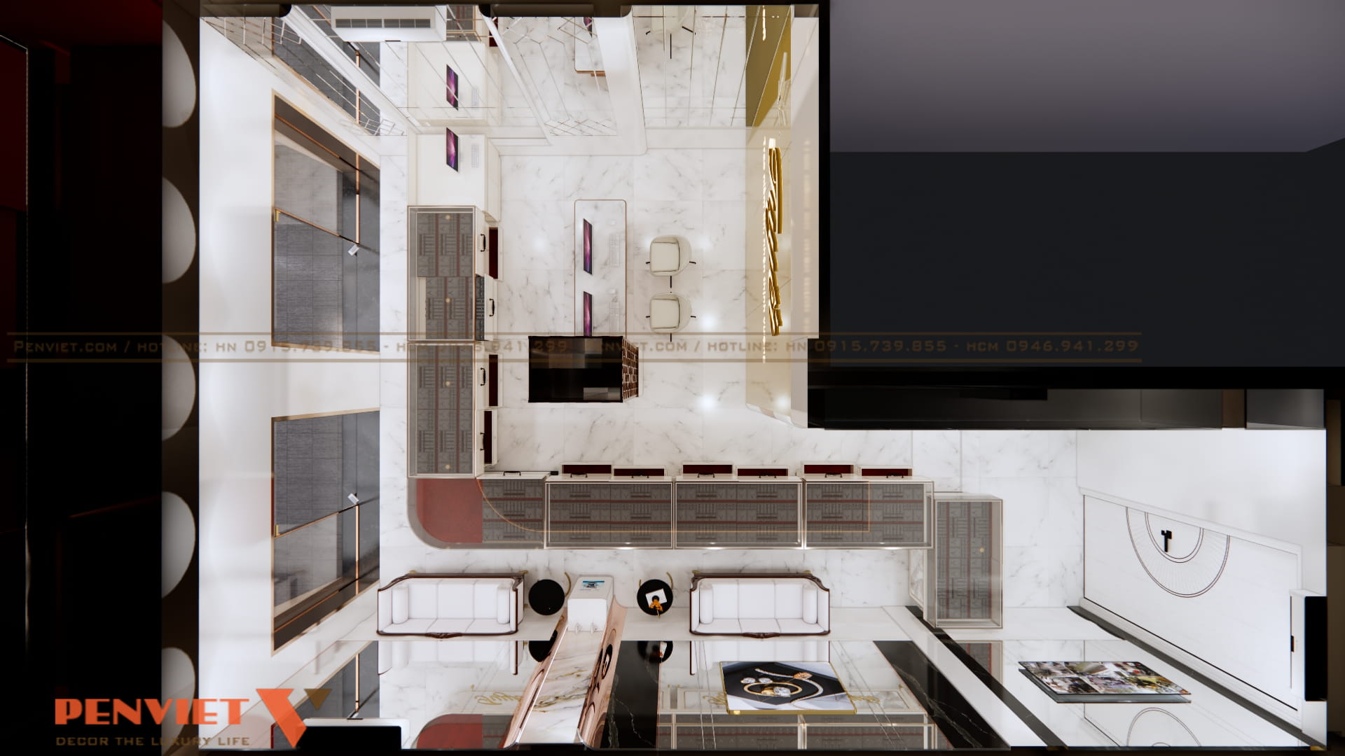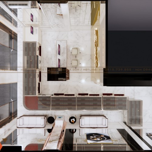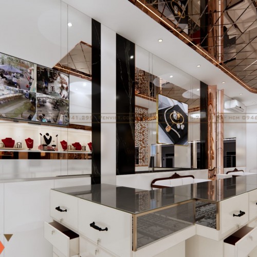 Không gian được chia thành các khu rõ ràng gồm khu trưng bày, khu giao dịch và khu chờ. Quầy giao dịch đặt ở vị trí trung tâm, giúp kiểm soát tốt toàn bộ không gian. Điều này đặc biệt quan trọng với ngành kinh doanh vàng bạc.