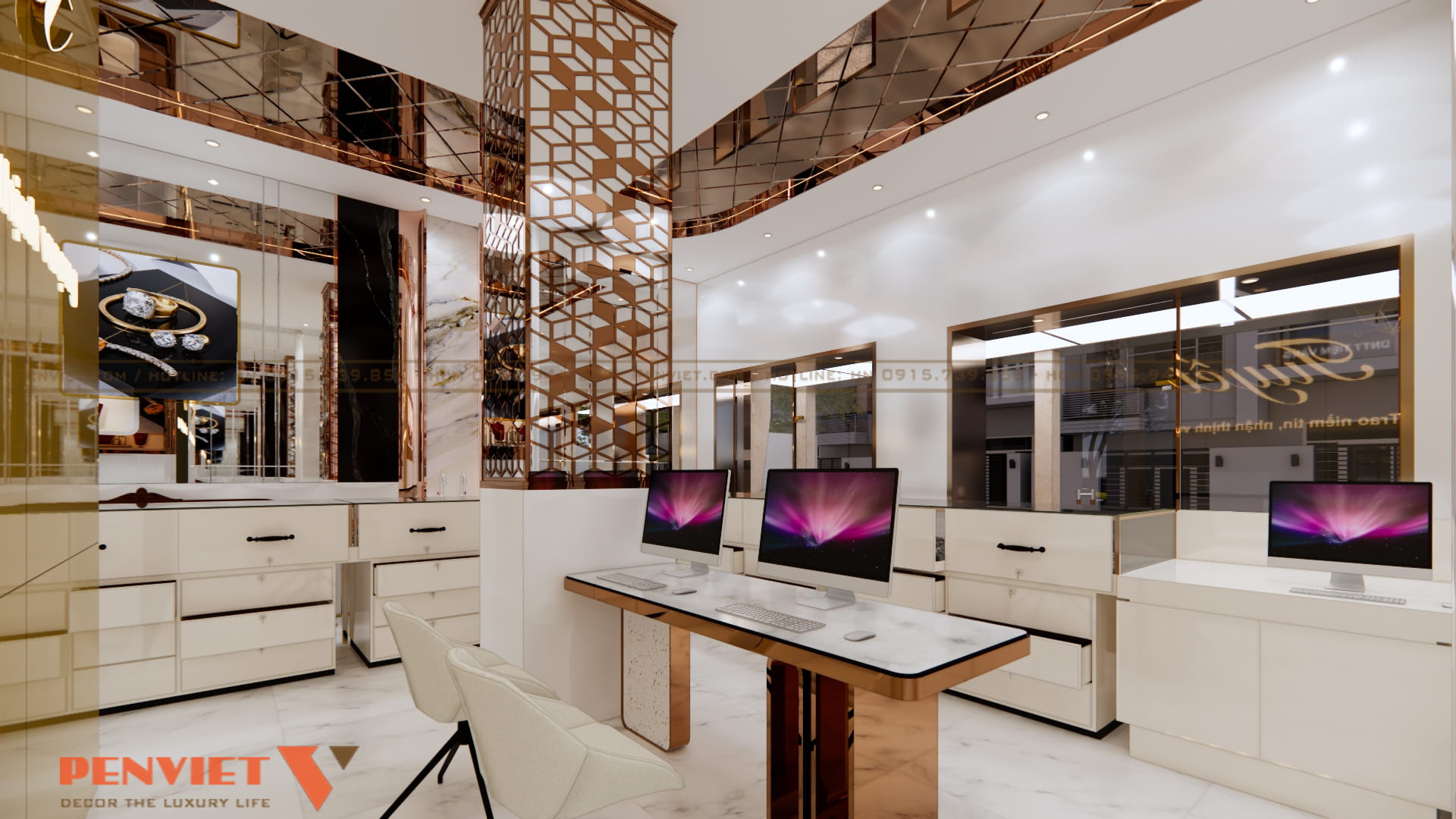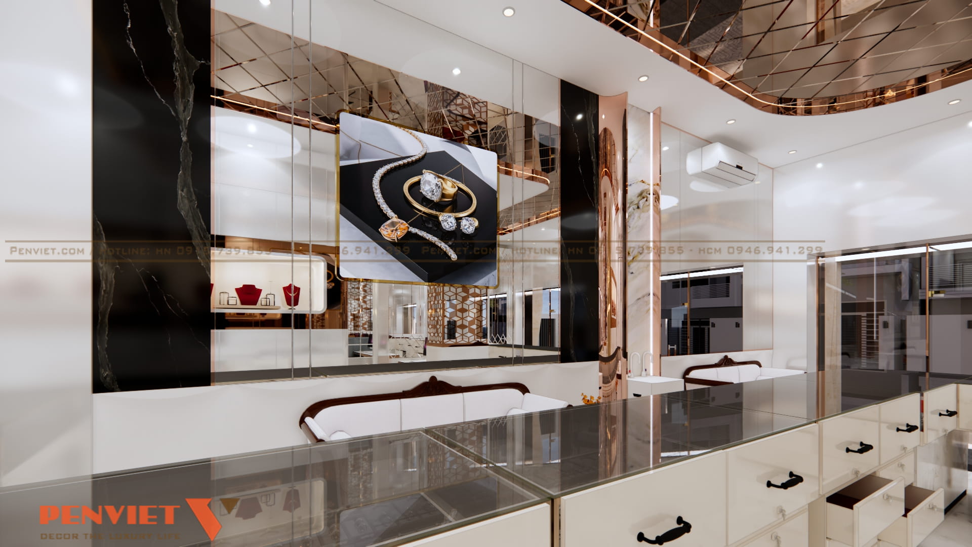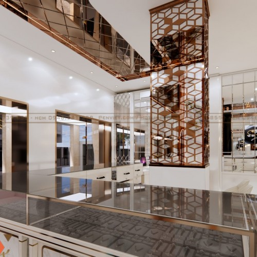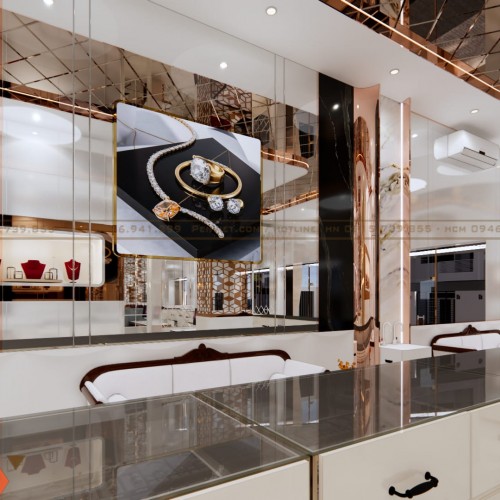 Hệ gương lớn và trần phản chiếu giúp không gian trở nên rộng hơn so với diện tích thực. Đây là giải pháp phù hợp với các tiệm vàng có mặt bằng vừa và nhỏ.