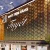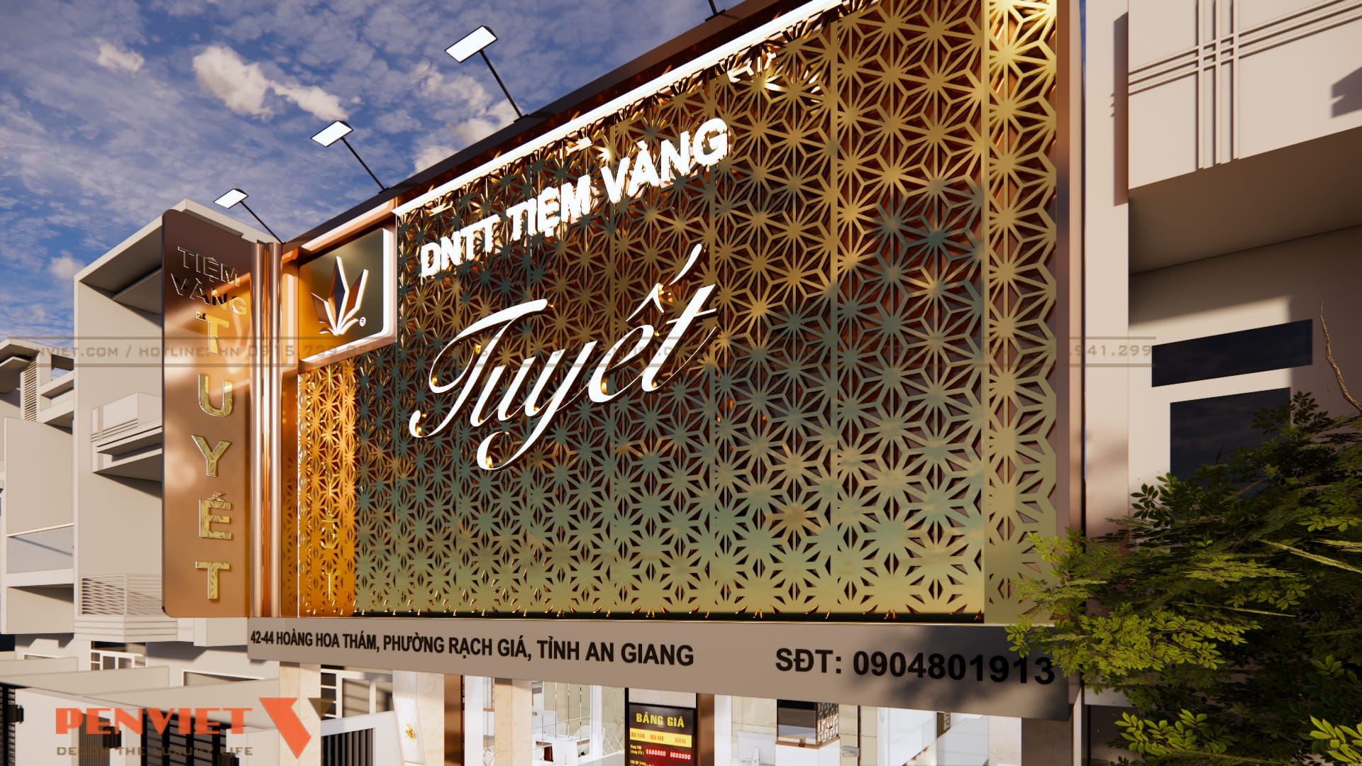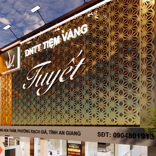 Mặt tiền được thiết kế nổi bật với tông vàng đồng chủ đạo, tạo cảm giác cao cấp ngay từ bên ngoài. Hệ bảng hiệu lớn kết hợp họa tiết kim loại cắt CNC giúp tăng độ nhận diện thương hiệu. Ánh sáng hắt từ trên xuống làm nổi bật logo và tên tiệm vào buổi tối.