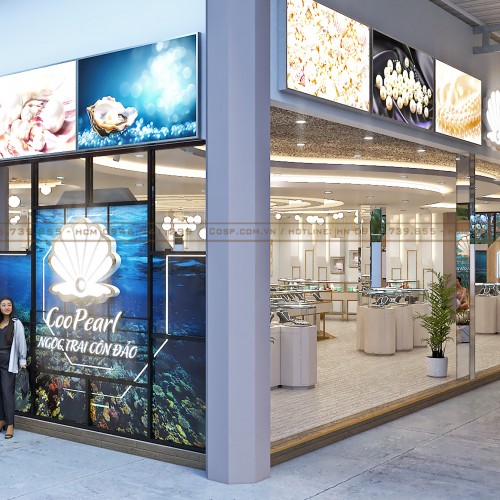 Mặt tiền của showroom trang sức thể hiện sự sang trọng và đẳng cấp, là điểm nhấn thu hút khách hàng ngay từ cái nhìn đầu tiên. Phần biển hiệu chính được thiết kế nổi bật với logo hình vỏ sò biểu trưng, đi kèm dòng chữ “CooPearl - Ngọc Trai Côn Đảo” sử dụng font chữ mềm mại, tinh tế và ánh sáng LED hắt nhẹ phía sau, tạo cảm giác cao cấp và dễ nhận diện ngay cả trong đêm. Hệ thống bảng hiệu phụ hai bên, được lắp đặt với các hình ảnh minh họa về ngọc trai và trang sức, làm nổi bật sản phẩm đặc trưng của showroom.