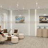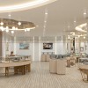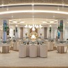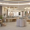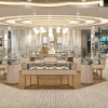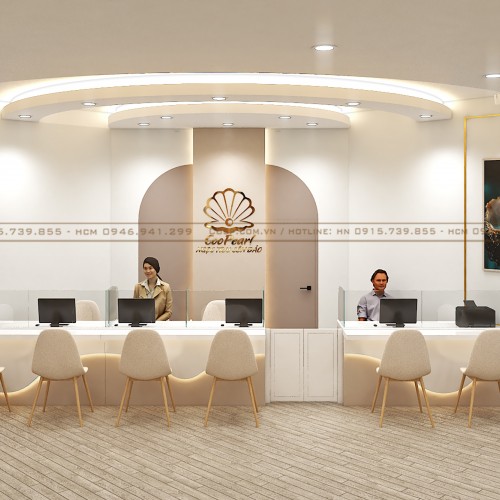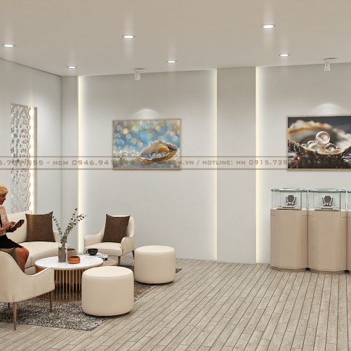 Không gian được làm ấm bởi ánh sáng dịu nhẹ từ các đèn thả nghệ thuật. Những bức tranh treo tường với họa tiết ngọc trai hoặc biển cả được sử dụng để tạo điểm nhấn, vừa mang ý nghĩa thương hiệu vừa tạo cảm giác thư thái. Khách hàng có thể ngồi lại, thư giãn và tận hưởng không gian trước khi đưa ra những quyết định mua sắm quan trọng.