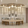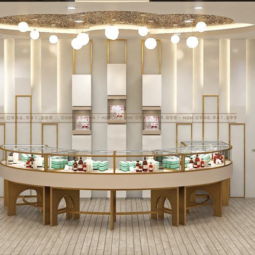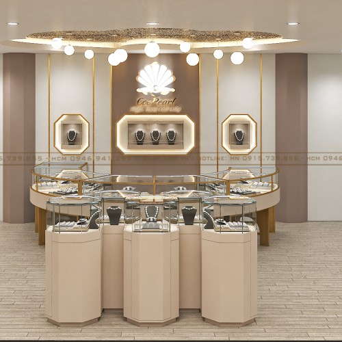 Khu vực trung tâm của shop là nơi tỏa sáng với những thiết kế trưng bày độc đáo. Các tủ được thiết kế theo hình dáng đa giác hoặc bo tròn mềm mại, sử dụng kính cường lực kết hợp viền kim loại mạ vàng hoặc đồng. Đặc biệt, bên trong mỗi tủ đều được lắp đặt hệ thống đèn LED ánh sáng trắng ấm, làm nổi bật vẻ đẹp tinh khiết và ánh sắc tự nhiên của từng viên ngọc trai.