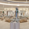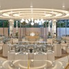 Trần nhà được trang trí bằng hệ thống đèn vòng tròn đồng tâm, kết hợp đèn thả dạng giọt nước, tạo ra hiệu ứng ánh sáng lung linh như những viên ngọc trai phát sáng trong đại dương. Chính sự sắp xếp này không chỉ làm tăng sự hấp dẫn của sản phẩm mà còn mang lại chiều sâu mỹ thuật cho không gian.