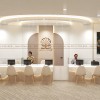 Quầy tiếp tân trung tâm đã thu hút mọi ánh nhìn nhờ thiết kế ấn tượng. Quầy được chế tác từ đá marble cao cấp với hoa văn tự nhiên tinh xảo, kết hợp viền kim loại mạ đồng sáng bóng, tạo nên sự hòa quyện giữa vẻ đẹp tự nhiên và sự hiện đại.