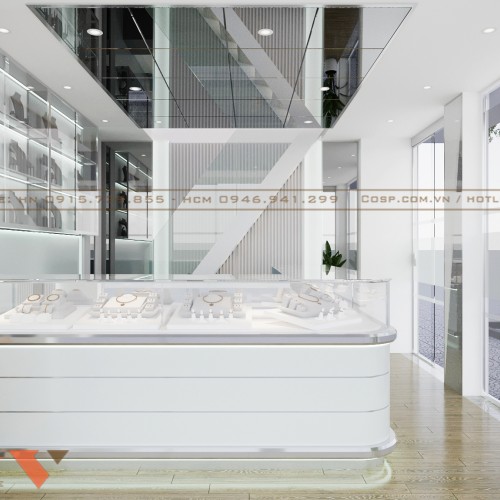 Bên trong quầy trưng bày, trang sức được sắp xếp khoa học, phân loại theo từng khu vực như nhẫn, vòng cổ, lắc tay, … giúp khách hàng dễ dàng lựa chọn. Hệ thống đèn LED tích hợp bên trong tủ kính giúp các sản phẩm trở nên lung linh và nổi bật hơn.