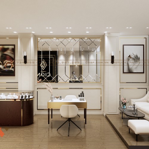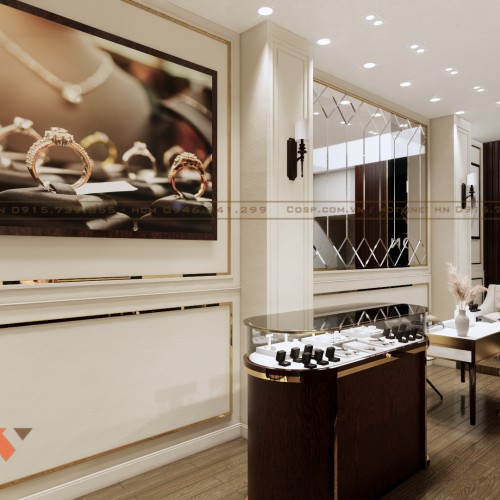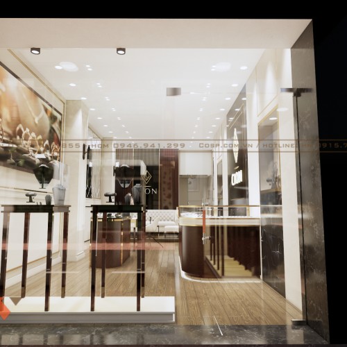 Điểm nổi bật nhất trong không gian của tiệm trang sức CION chính là khu vực trưng bày sản phẩm. Với diện tích chỉ 30m2, việc bố trí các tủ trưng bày hợp lý là điều quan trọng để tối ưu hóa không gian cũng như tính thẩm mỹ. Các tủ được sắp đặt để tận dụng tối đa diện tích và giúp khách hàng dễ dàng di chuyển quan sát sản phẩm.