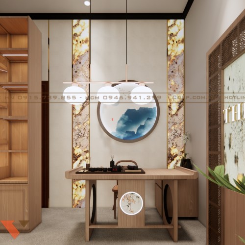 Ngay trung tâm cửa hàng là bàn trà đạo bằng gỗ tự nhiên được thiết kế tỉ mỉ. Mặt bàn rộng vừa phải, tích hợp bộ dụng cụ pha trà truyền thống, mang đến cảm giác thanh tịnh và thư giãn. Kiểu dáng bàn vuông vức, chân bàn tròn cách điệu thể hiện triết lý phong thủy cân bằng âm dương.