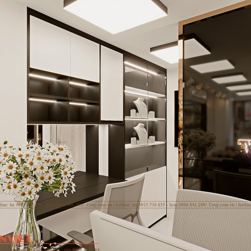 Tận dụng không gian trống chúng tôi sử dụng tủ trưng bày kết hợp tủ tài liệu để không bị lãng phí không gian và giúp khu vực này trở nên gọn gàng hơn.