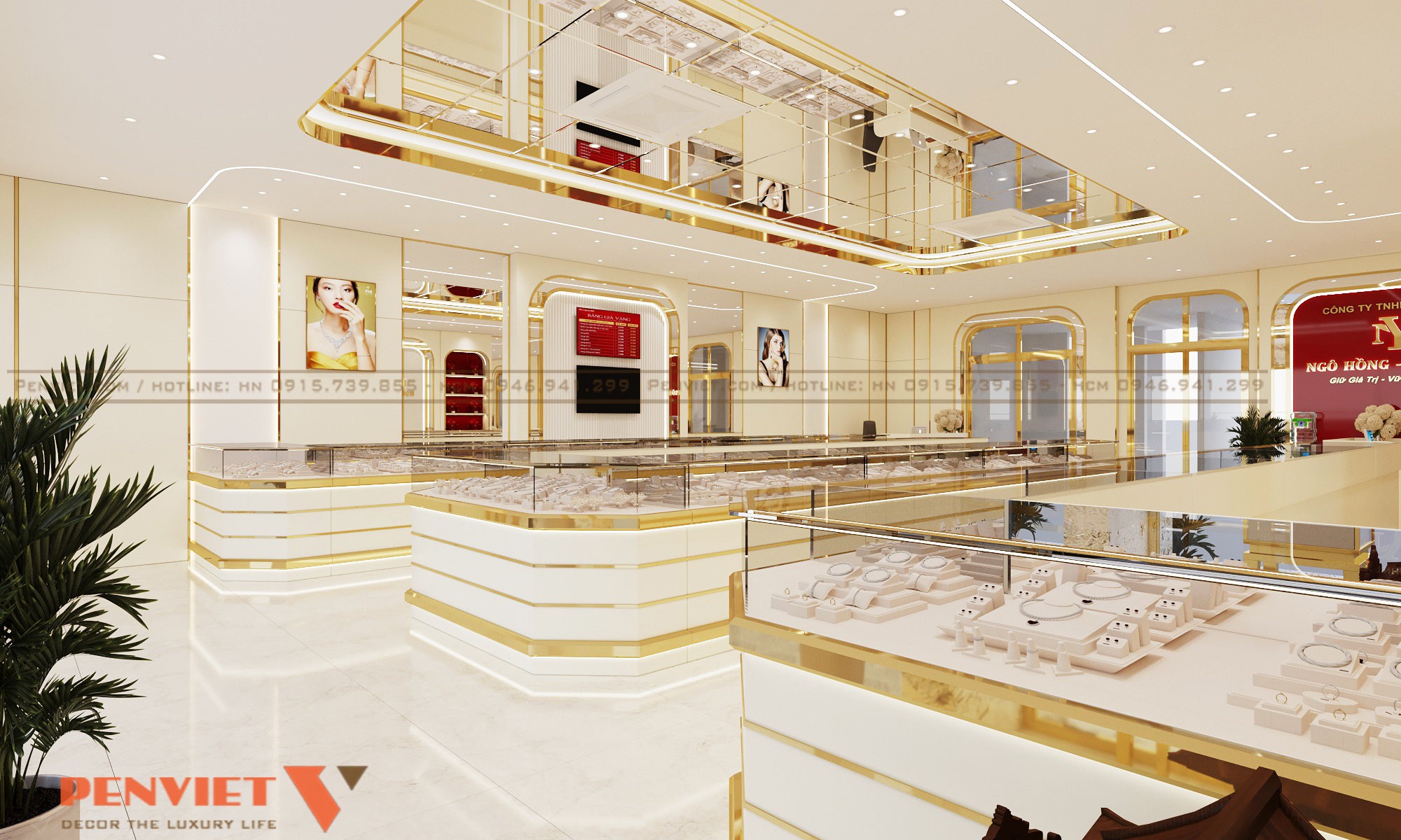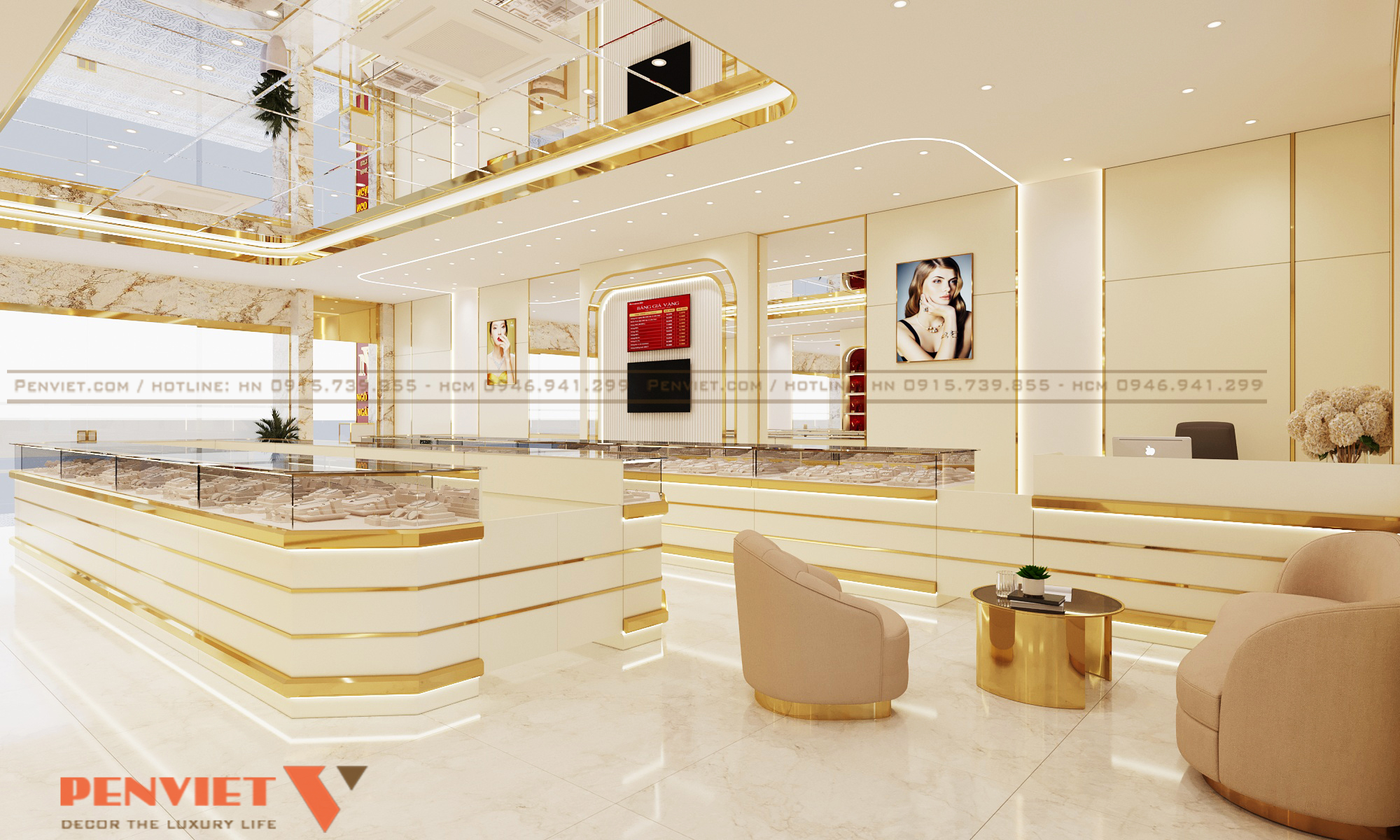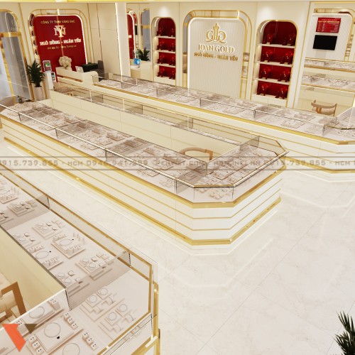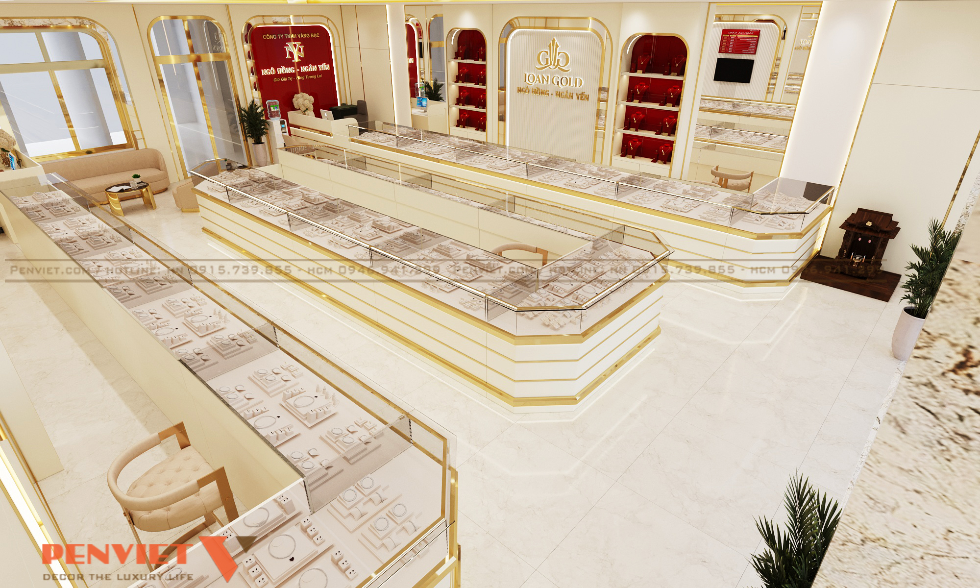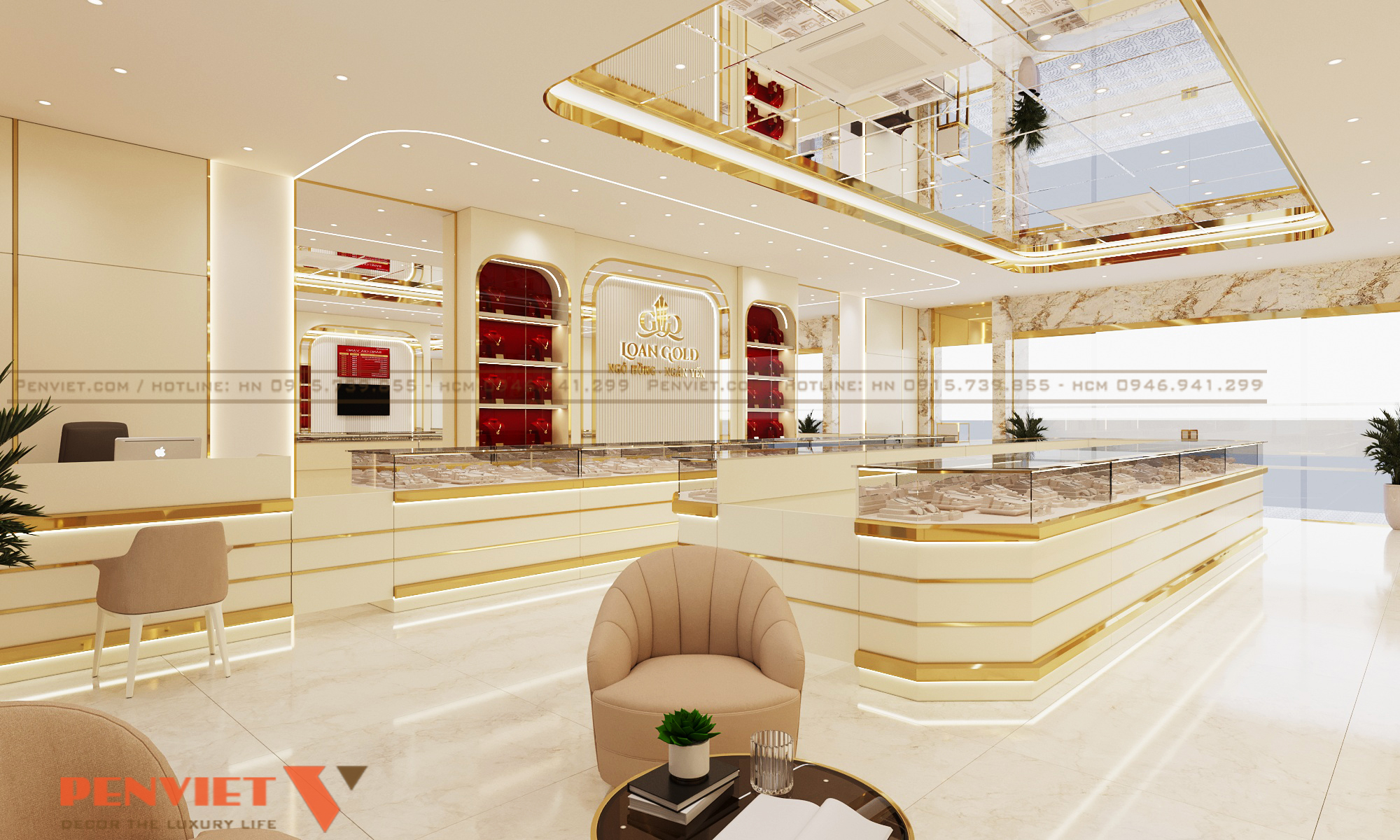 Không gian sang trọng tạo ấn tượng ngay khi bước vào. Thiết kế đồng bộ giúp nâng tầm thương hiệu. Đây là yếu tố quan trọng trong ngành kinh doanh vàng bạc.