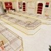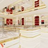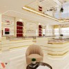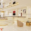 Trần và hệ đèn được xử lý tinh tế. Các đường cong mềm giúp giảm cảm giác cứng của không gian lớn. Vật liệu như kính, kim loại mạ vàng tạo hiệu ứng phản chiếu tốt. Điều này giúp cửa hàng luôn nổi bật và thu hút.