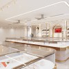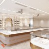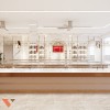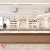 Không gian được tổ chức theo mô hình đối xứng với hệ thống quầy trưng bày kính ở hai bên và dãy quầy trung tâm, tạo nên một hành lang rộng rãi, thông thoáng, giúp khách dễ dàng quan sát và di chuyển.