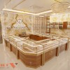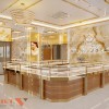 Trung tâm cửa hàng là hệ thống tủ thiết kế hình chữ U bo góc mềm mại, tạo thành một vùng trưng bày tập trung, thuận tiện cho khách hàng di chuyển mua sắm. Tủ sử dụng chất liệu gỗ MDF cốt xanh bền bỉ kết hợp kính cường lực trong suốt và viền bằng kim loại ánh vàng tôn lên vẻ đẹp lung linh từng món trang sức.