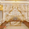 Bước vào tiệm vàng BẢO TÍN HƯNG CHÂU, ấn tượng đầu tiên đến từ không gian rộng rãi, bố trí nội thất khoa học và ánh sáng được xử lý cực kỳ chuyên nghiệp. Tone màu chủ đạo là sự kết hợp giữa trắng, vàng kim và gỗ nâu trầm, mang đến sự sang trọng và gợi liên tưởng đến giá trị bền vững của vàng. Các chi tiết kim loại mạ vàng sáng bóng xuất hiện từ chân tủ, viền gương, khung trần đến tay nắm cửa có sự đồng điệu và cao cấp.