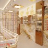 Phía sau và hai bên khu vực trung tâm là các quầy phụ và tủ gỗ cao, giúp tăng thêm không gian trưng bày mà vẫn giữ được sự gọn gàng, ngăn nắp.