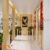 Ngoài đèn trung tâm, hệ thống đèn rọi ray trần được bố trí đều khắp trần theo dọc hai bên, chiếu thẳng xuống các tủ trưng bày và tranh treo tường. Loại đèn này vừa giúp làm nổi bật sản phẩm, vừa tăng chiều sâu cho không gian. Viền trần được mạ viền vàng ánh kim, tạo hiệu ứng phản chiếu và tăng cảm giác sang trọng khi nhìn tổng thể từ dưới lên.