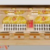 Hệ thống tủ trưng bày âm tường được ốp nền vàng marble cao cấp, tạo chiều sâu cho không gian. Sắc vàng xen lẫn ánh trắng tạo hiệu ứng sáng đều, giúp các sản phẩm trang sức tỏa sáng mà không cần quá nhiều chi tiết trang trí.