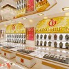 Biển hiệu phía trong tiệm được thiết kế nổi bật với dòng chữ “Vàng bạc đá quý Công Hương”, sử dụng font chữ lớn, mạ vàng, kết hợp biểu tượng logo màu đỏ sang trọng. Tông màu vàng đỏ được phối hài hòa, thể hiện giá trị thương hiệu và truyền tải thông điệp về sự may mắn, thịnh vượng.