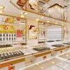 Sàn tiệm được lát gạch màu be sáng, vừa sạch sẽ vừa giúp phản xạ ánh sáng, làm nổi bật sắc vàng của trang sức. Các góc tường được bo viền mạ vàng nhẹ, mang đến cảm giác liền mạch và cao cấp.