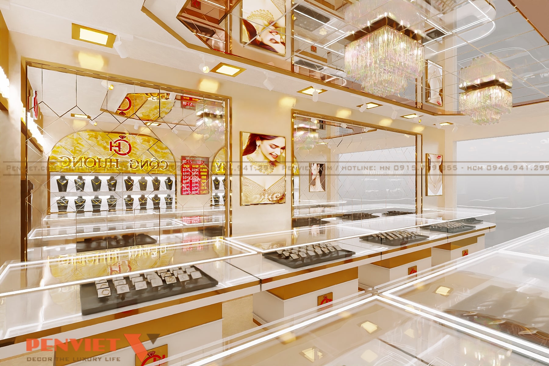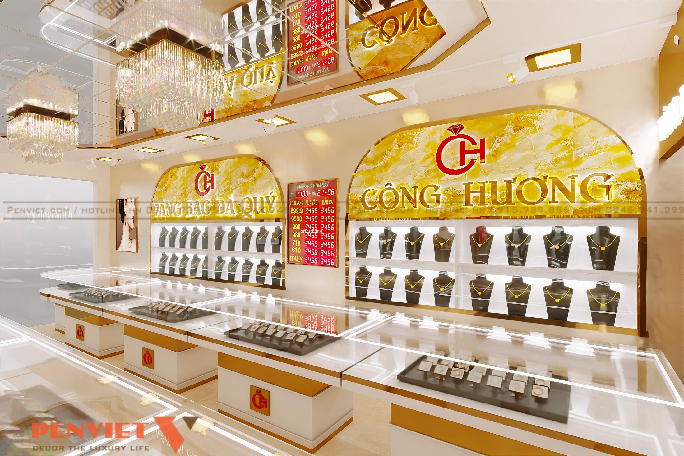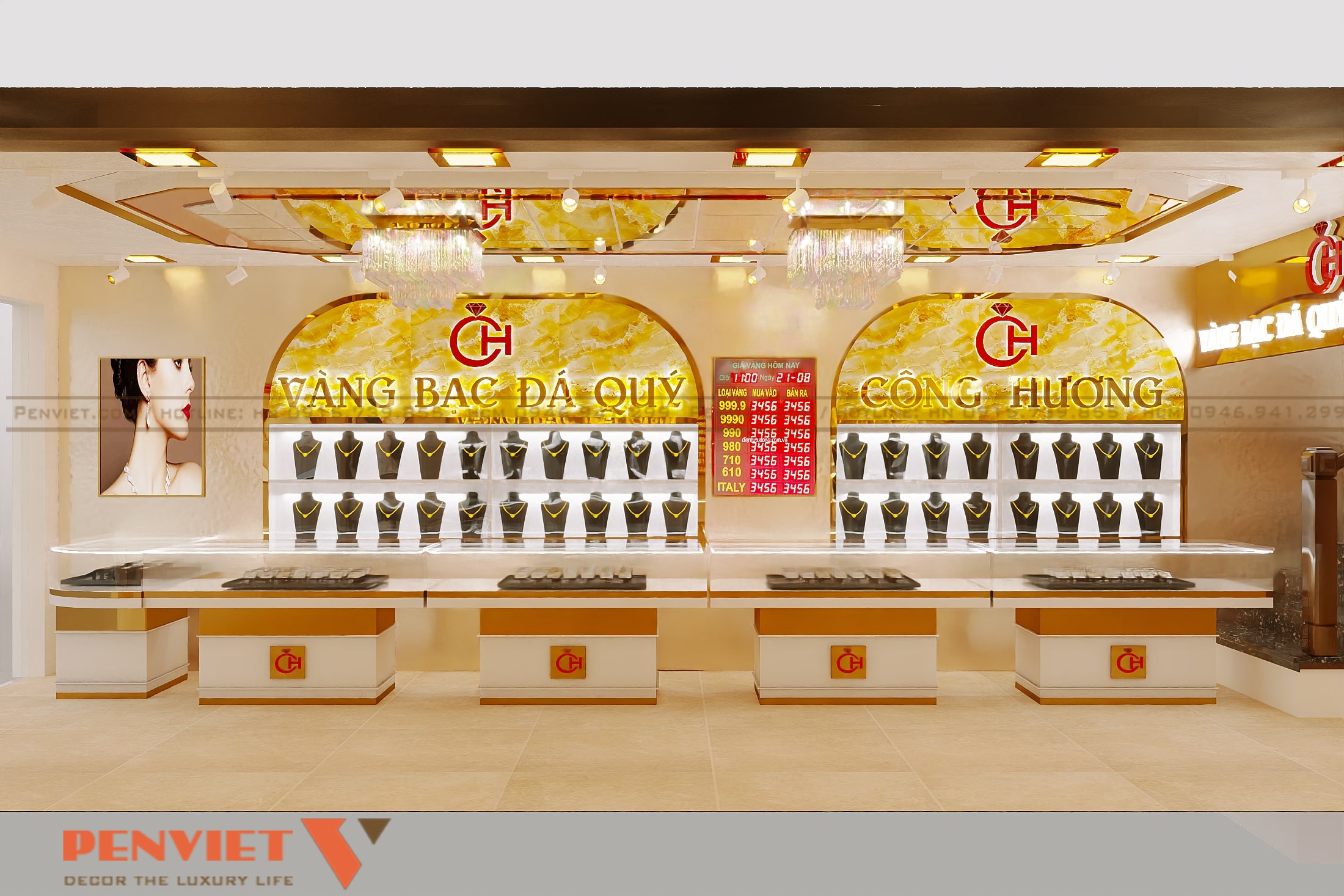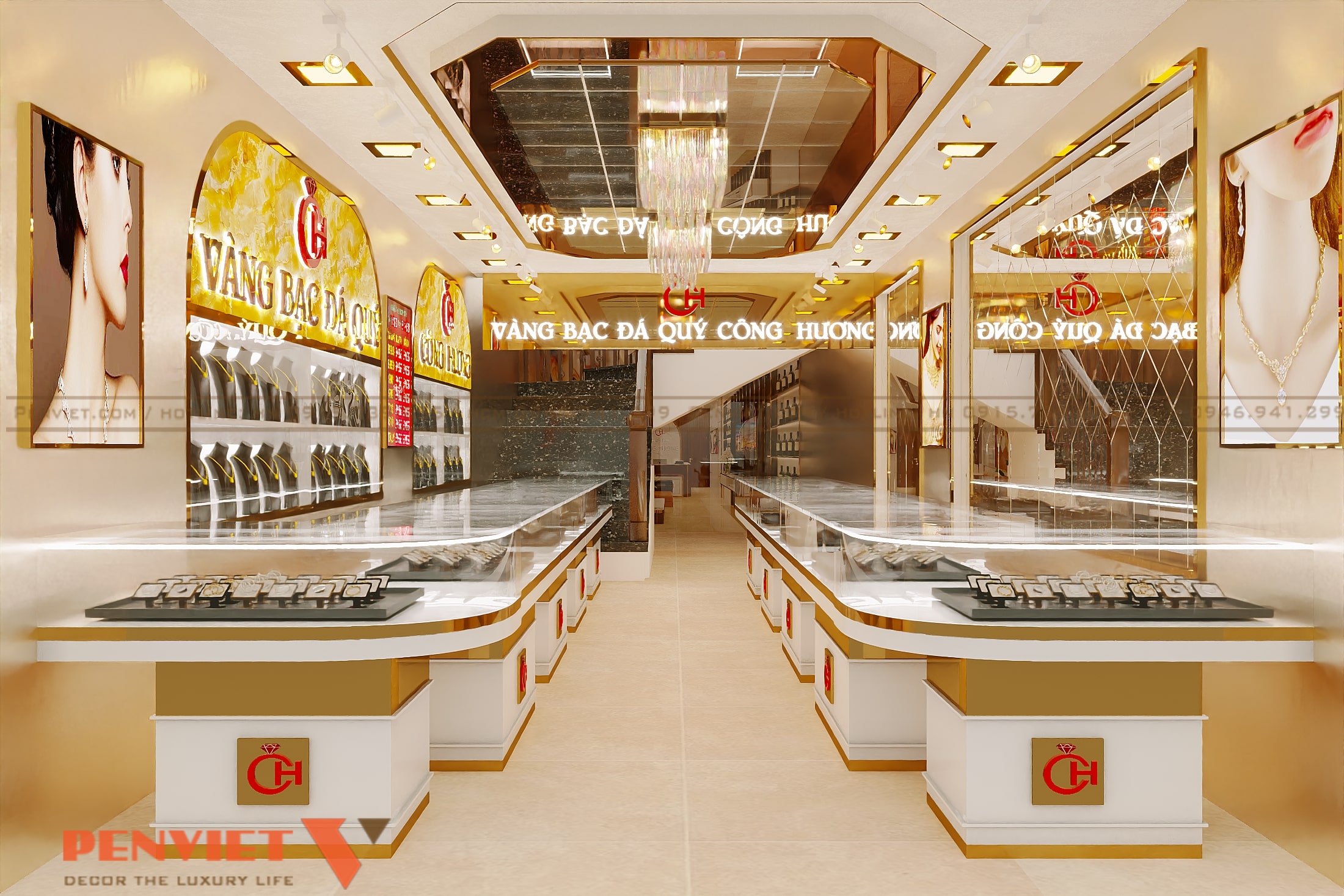 Đối với lĩnh vực kinh doanh trang sức vàng bạc, không gian trưng bày luôn đóng vai trò quan trọng trong việc định hình giá trị thương hiệu và thu hút khách hàng. Dự án thiết kế tiệm vàng Chị Hương tại Lào Cai có diện tích 40m2 nhưng đáp ứng đủ công năng. Đội ngũ thiết kế PenViet đã tạo nên một không gian hiện đại, chuyên nghiệp, tinh tế, giúp tối ưu trải nghiệm mua sắm cũng như tôn vinh vẻ đẹp từng sản phẩm.
