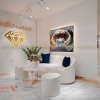 Điểm đặc biệt của quầy trưng bày này là logo được đặt phía trước, nổi bật giữa không gian tiệm. Đây là phương án tăng sự nhận diện thương hiệu và góp phần gây ấn tượng mạnh mẽ với khách hàng. Logo được thiết kế đơn giản nhưng đầy tính thẩm mỹ, góp phần mang lại sự sang trọng và tinh tế cho không gian.