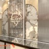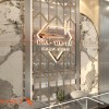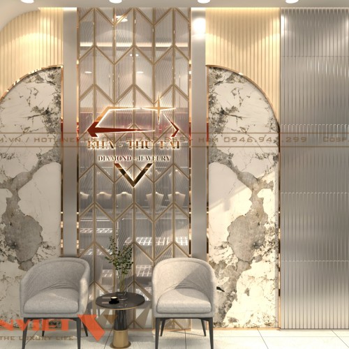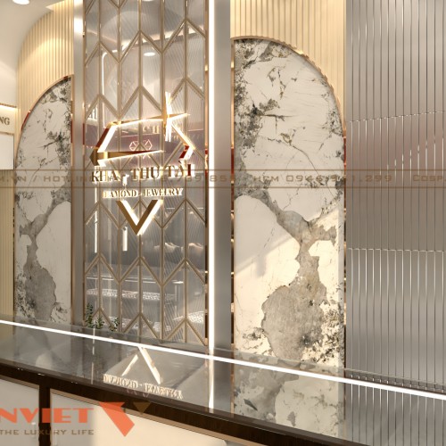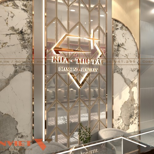 Điểm nhấn quan trọng khác trong thiết kế tiệm vàng Kha Thu Tài là vách logo thương hiệu đặt ở khu vực tiếp khách. Chất liệu sử dụng là đá ốp vân mây kết hợp kim loại ánh vàng sang trọng, hiện đại. Logo Kha Thu Tài Diamond Jewelry được làm nổi bật bằng đèn LED hắt sáng, tạo hiệu ứng lung linh và gây ấn tượng mạnh mẽ.