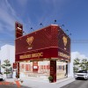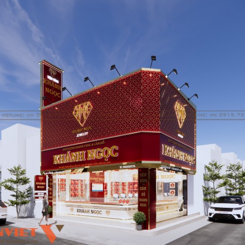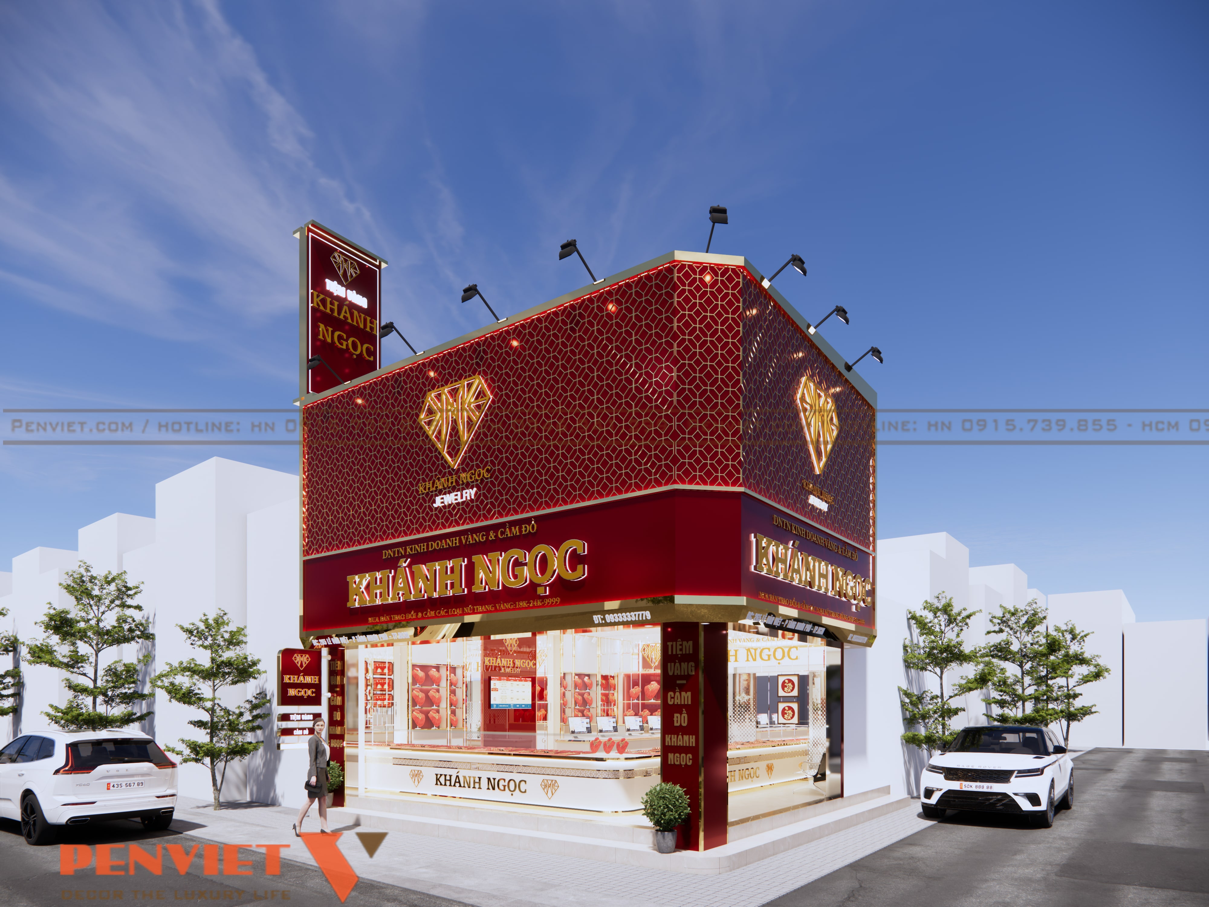 Mặt tiền tiệm vàng Khánh Ngọc gây ấn tượng với bảng hiệu lớn phủ sắc đỏ đặc trưng. Màu đỏ kết hợp với vàng ánh kim tạo nên hiệu ứng sang trọng và thu hút từ xa. Bảng hiệu được thiết kế đồng bộ với logo hình kim cương ở vị trí trung tâm, giúp nhận diện thương hiệu rõ ràng và nổi bật giữa khu phố.