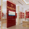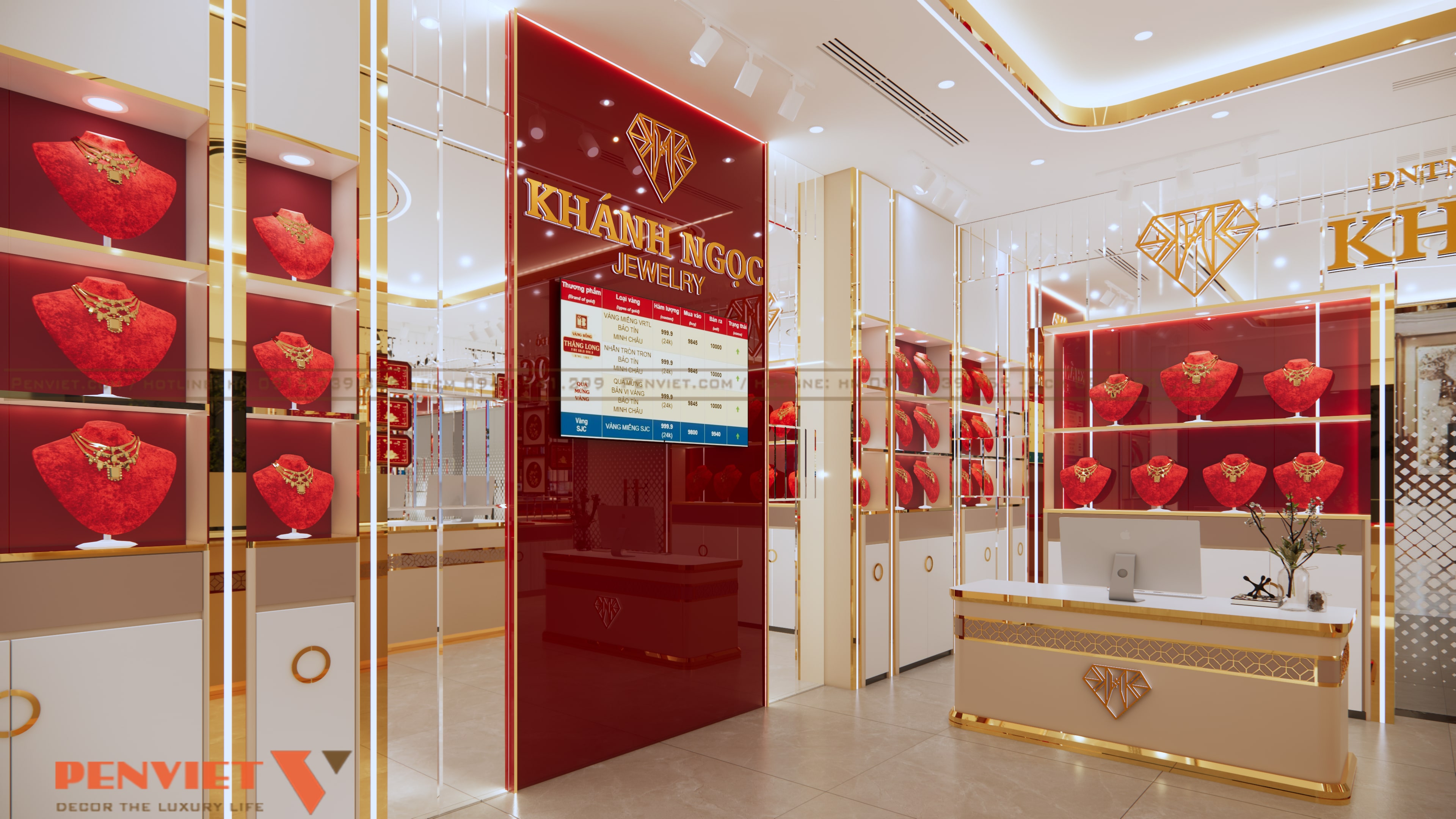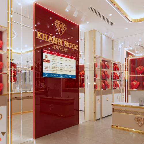 Bước vào bên trong thiết kế tiệm vàng Khánh Ngọc, khách hàng dễ dàng cảm nhận không khí sang trọng và tinh tế. Tông màu chủ đạo là đỏ và vàng, hai gam màu quen thuộc trong ngành vàng bạc, tượng trưng cho tài lộc và thịnh vượng. Sự kết hợp giữa hai màu này được thể hiện hài hòa trên từng chi tiết, từ tủ trưng bày, bảng hiệu nội thất cho đến các mảng tường ốp kính.