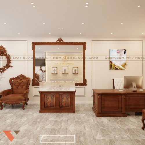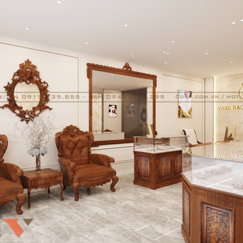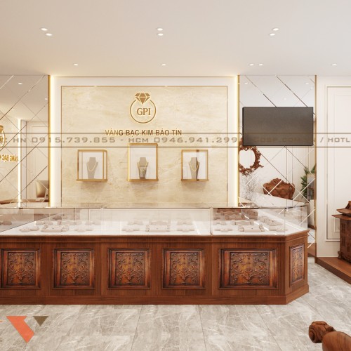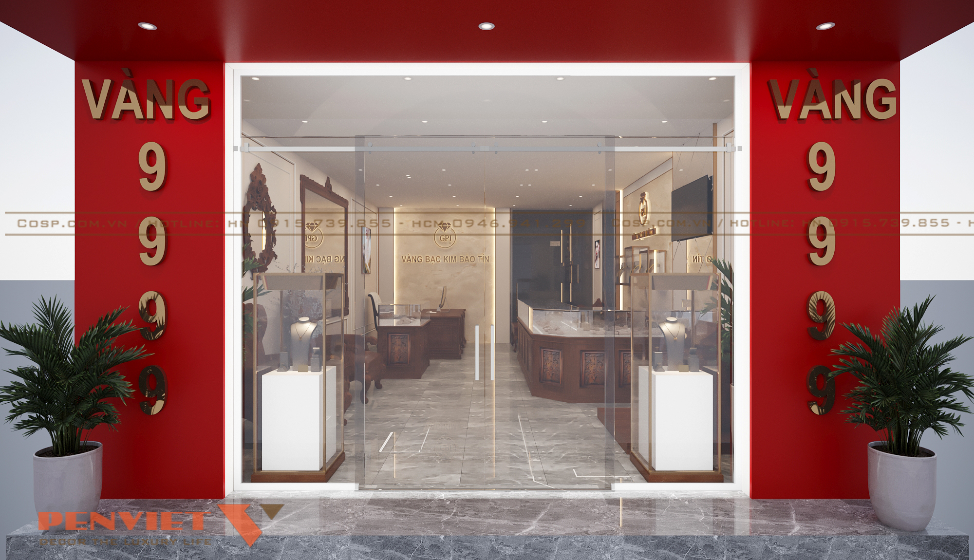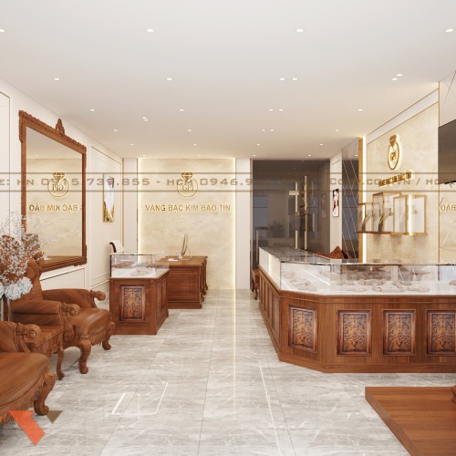 Thiết kế tiệm vàng Kim Bảo Tín sử dụng hệ tủ trưng bày và bàn ghế gỗ tự nhiên sang trọng. Đây là sự kết hợp hoàn hảo giữa nghệ thuật thiết kế và phong thủy từ tổng quan đến chi tiết. Hãy liên hệ PenViet ngay hôm nay để được các chuyên gia tư vấn thêm về các ý tưởng thiết kế không gian.