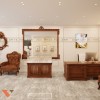 Ngay khi bước vào tiệm, khách hàng sẽ bắt gặp khu vực đón tiếp được bài trí tinh tế với bộ ghế salon đặc biệt. Ghế được làm từ gỗ cao cấp, mang đặc trưng hoa văn độc đáo, nhấn mạnh tính thẩm mỹ truyền thống. Tổng thể không gian được bao phủ bởi màu sắc ấm áp, góp phần tạo cảm giác thân thiện và chào đón.