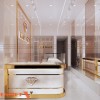 Quầy trưng bày là khu vực trung tâm. Thiết kế sử dụng kính cường lực kết hợp khung kim loại vàng. Vật liệu này vừa chắc chắn vừa sang trọng. Chủ đầu tư có thể yên tâm về độ bền và tính bảo mật.