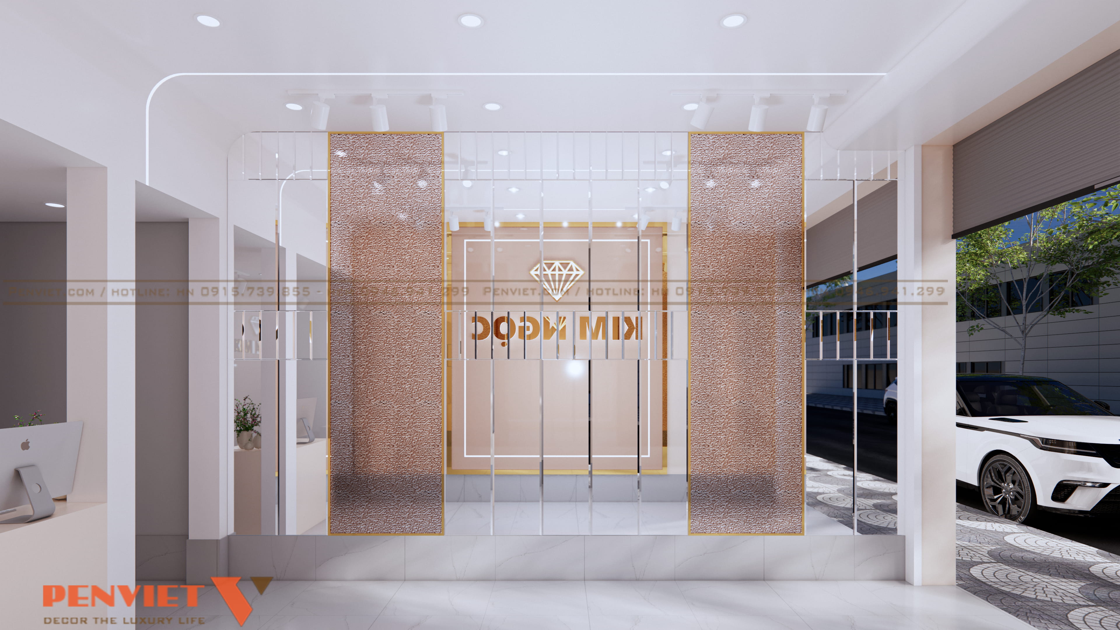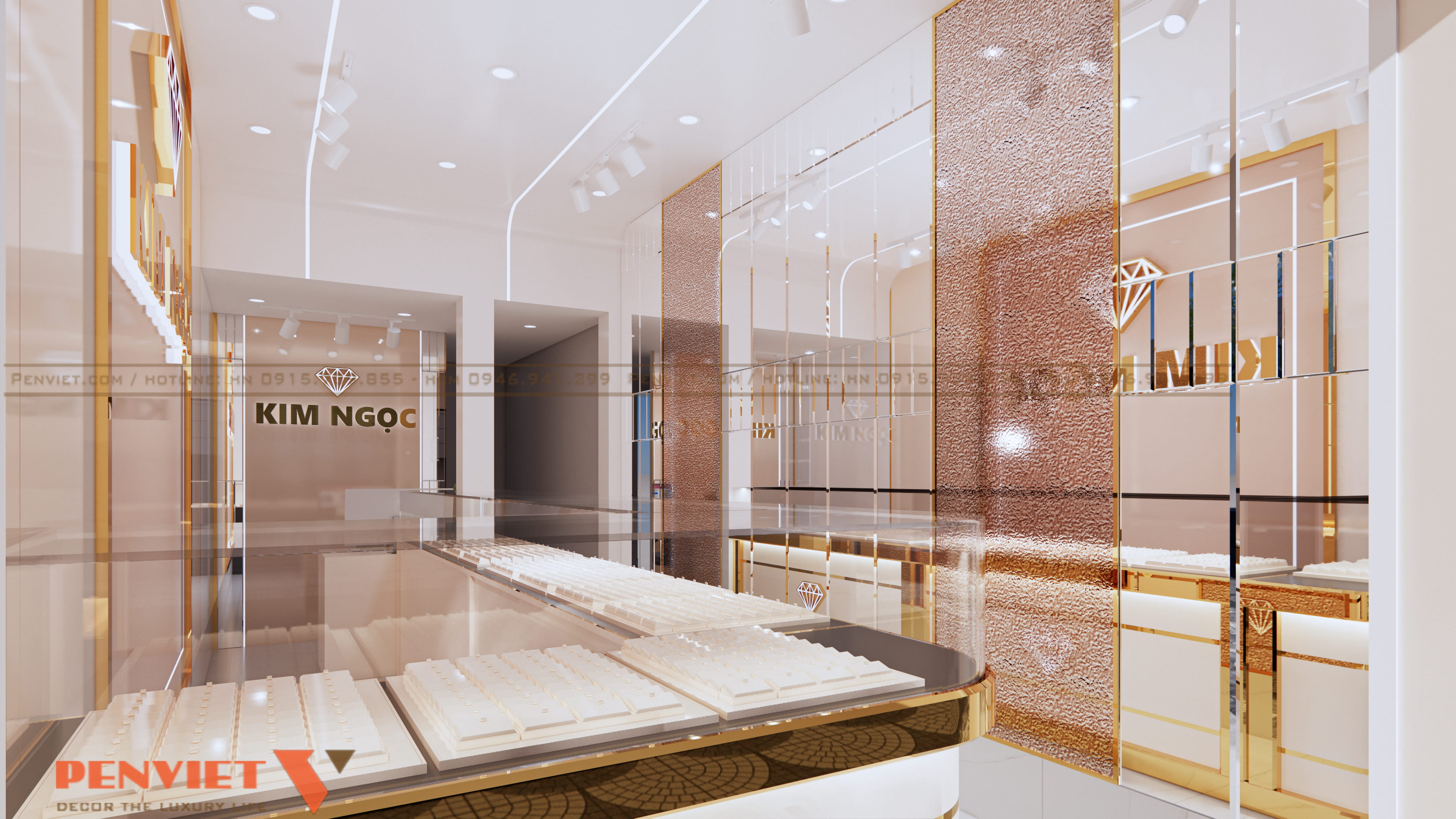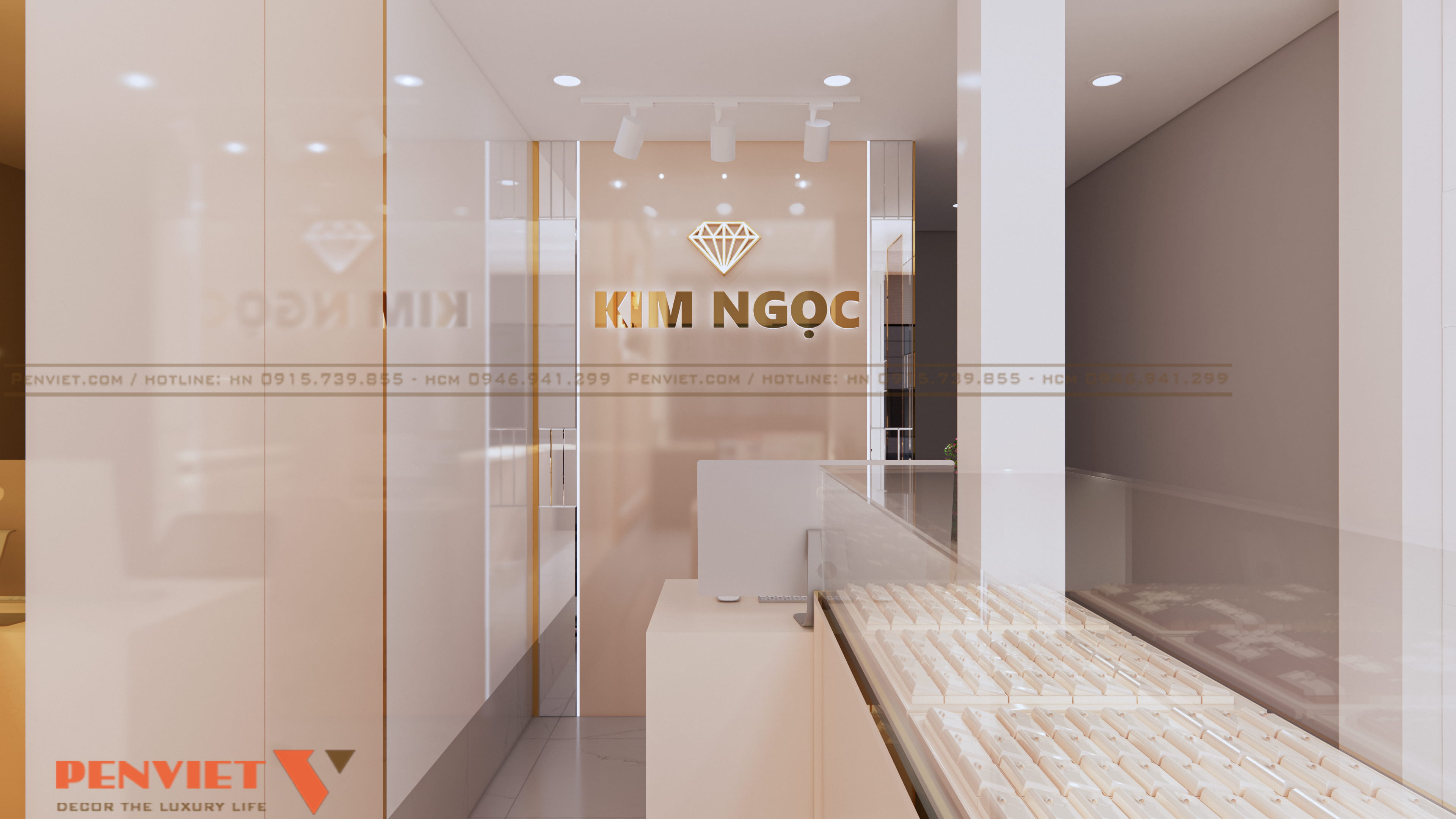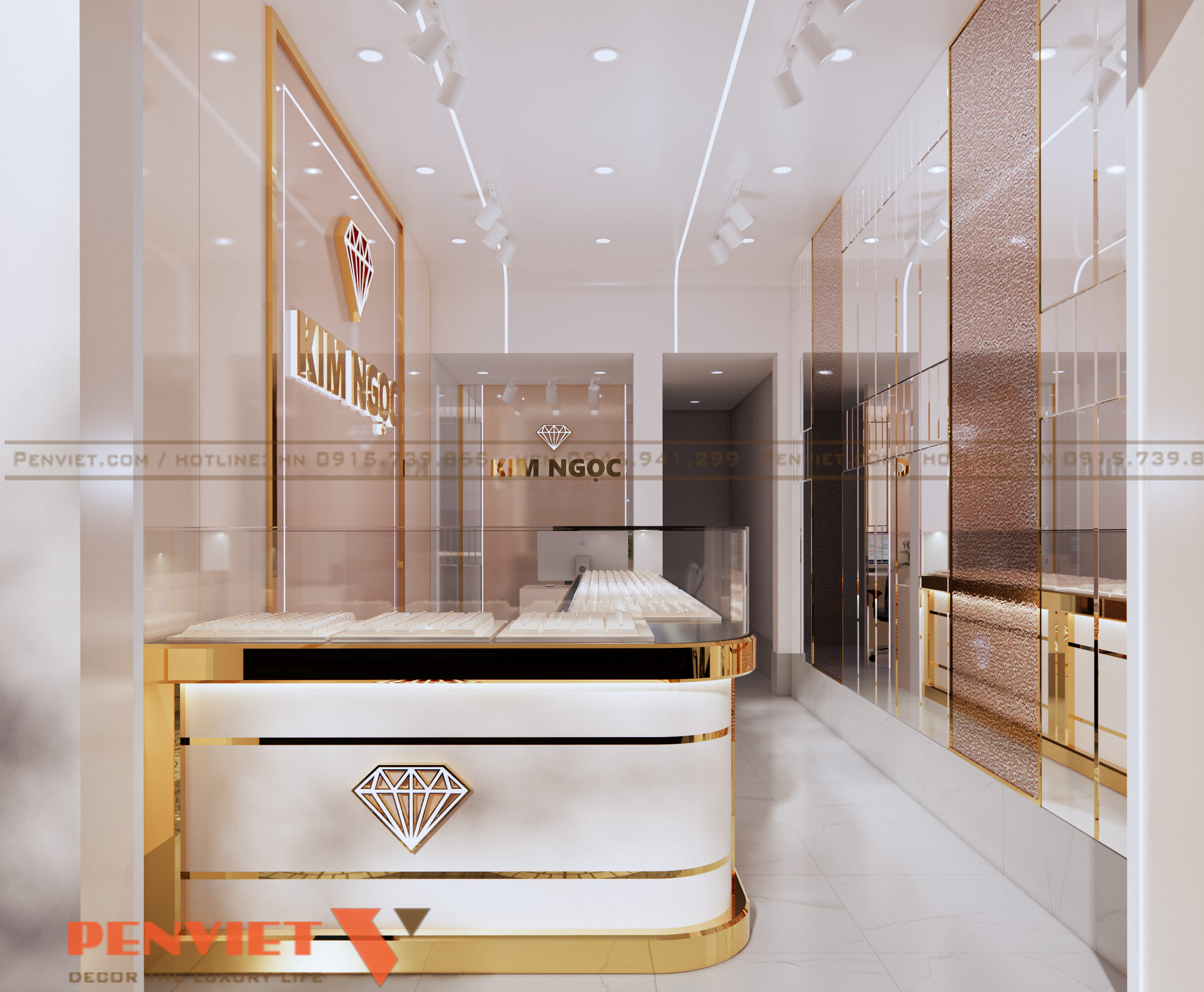 Bảng hiệu logo Kim Ngọc được đặt tại mảng tường trung tâm. Biểu tượng kim cương nổi bật trên nền sáng. Tên thương hiệu sử dụng chữ kim loại ánh vàng. Cách thể hiện tạo ấn tượng mạnh và dễ ghi nhớ.