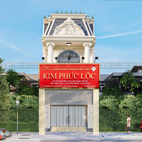 Mặt tiền mẫu thiết kế tiệm vàng Kim Phúc Lộc được xây dựng theo phong cách hiện đại kết hợp tân cổ điển nhẹ. Phần trên của công trình được trang trí bằng các chi tiết phào chỉ và mái ngói xám tạo điểm nhấn kiến trúc. Màu sơn trắng kết hợp viền vàng mang lại cảm giác sang trọng, thanh lịch.
