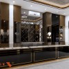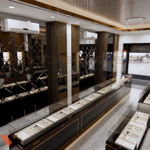 Hệ thống tủ trưng bày trang sức là điểm nhấn không thể thiếu trong thiết kế tiệm vàng KIM SOL. Khu vực này được thiết kế đồng bộ với hệ tủ khung viền nhôm sơn đen, kết hợp chi tiết viền mạ vàng, mặt kính cường lực trong suốt giúp khách hàng dễ dàng quan sát sản phẩm. Bên trong tủ, đèn LED ánh sáng trắng và vàng được bố trí hợp lý, làm nổi bật độ lấp lánh của vàng, kim cương và đá quý.