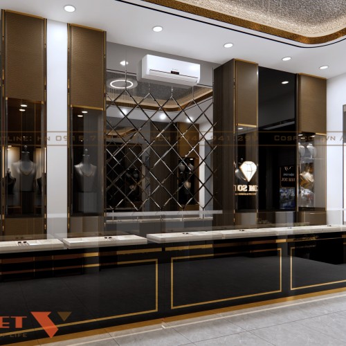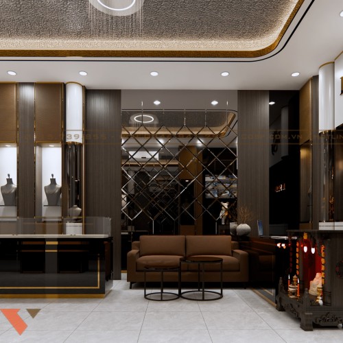 Không gian có bố cục khoa học, rộng rãi, kết nối mạch lạc giữa khu vực trưng bày trang sức, khu vực tiếp khách và bàn làm việc. Sự hài hòa trong thiết kế tạo cảm giác thoải mái cho khách hàng khi trải nghiệm mua sắm.