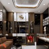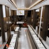 Trên trần, các vòng đèn trang trí dạng thả kết hợp với trần giật cấp và mảng ốp vàng ánh kim tạo điểm nhấn hiện đại, tinh tế. Ngoài ra, đèn trong các tủ trưng bày được thiết kế không chiếu thẳng vào mắt người nhìn mà tập trung làm sáng sản phẩm, giúp tăng độ hấp dẫn thị giác.