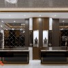 Vật liệu sử dụng chủ yếu là gỗ công nghiệp cao cấp, mica bóng gương, inox mạ vàng và kính cường lực. Những vật liệu này không chỉ tạo hiệu ứng ánh sáng đẹp mắt mà còn dễ lau chùi, bảo trì đảm bảo sự sáng bóng liên tục.